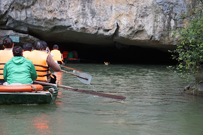 船夫划进第三个洞穴,这个洞穴的钟乳石缤纷色彩,可能是打灯的关系,也可能原本就是如此的色彩。钟乳石很低,我们也必须低着头,免得被撞到。没多久,就划出了洞穴,又回到寺庙。这一次,船夫让我们下船,然后交代我们记得上船。